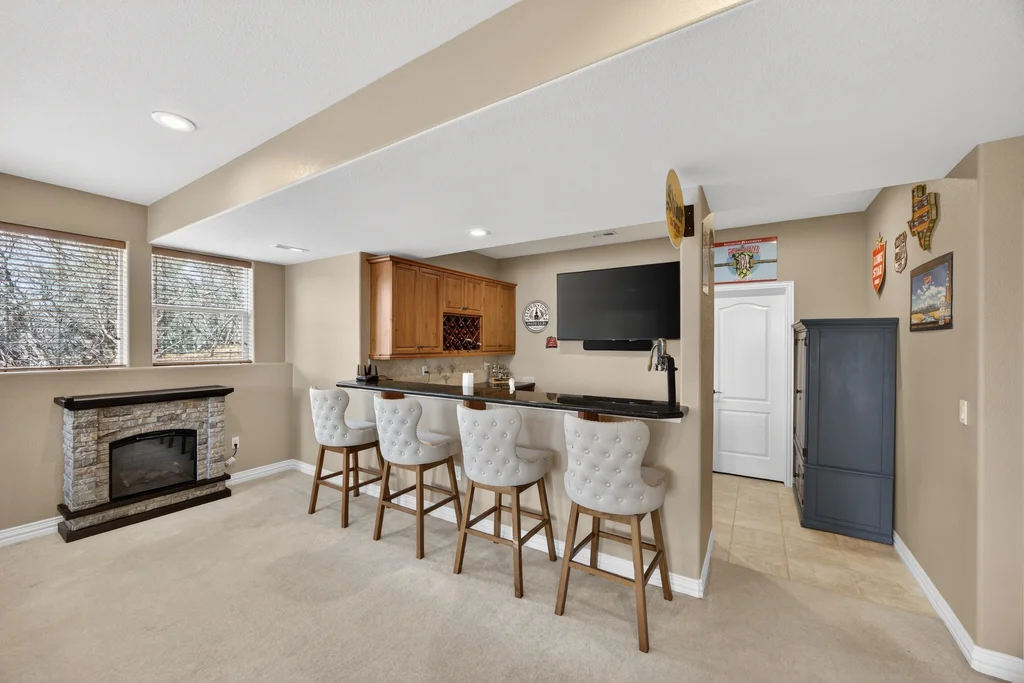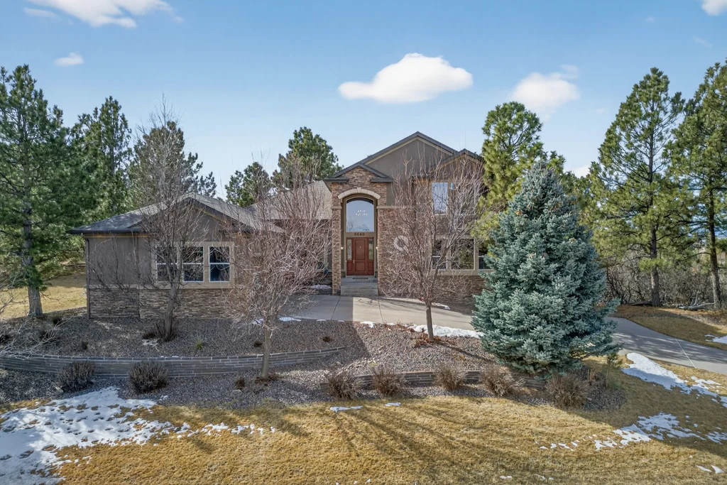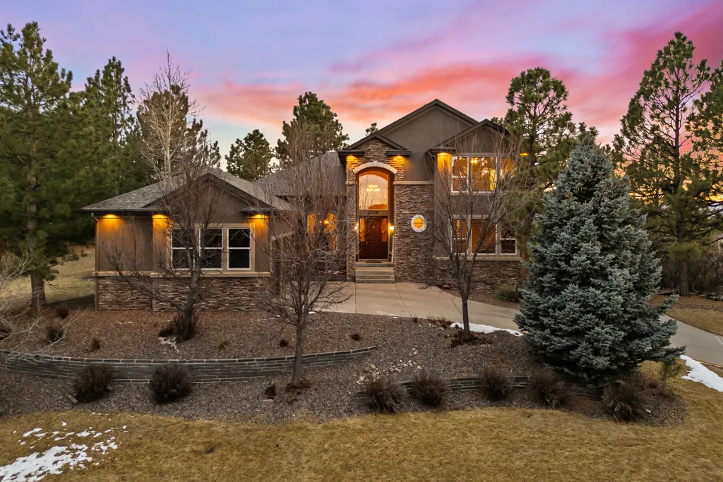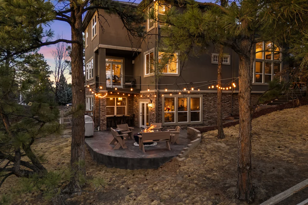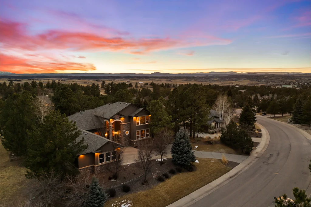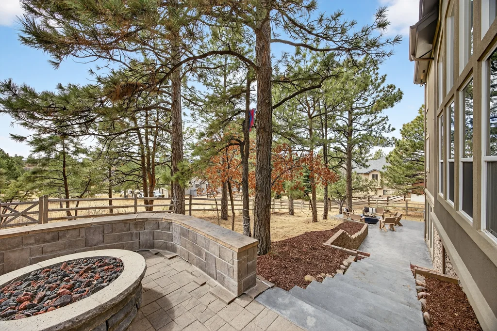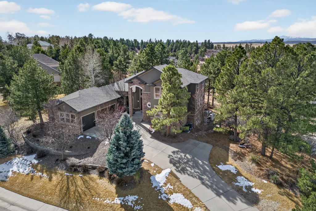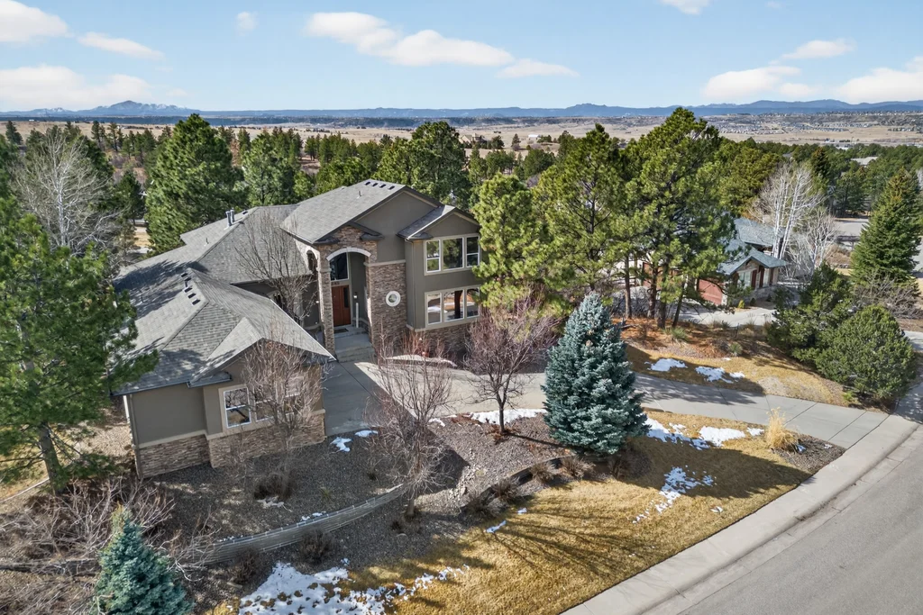 Set in The Timbers at The Pinery, this beautiful home offers peaceful Colorado views, privacy, and an ideal layout for everyday living and entertaining just minutes from downtown Parker. With over 4,800 finished sq ft, 5 bedrooms and 6 baths, the floorplan shines with a main-floor primary suite featuring a cozy fireplace, 5-piece bath, and oversized walk-in closet, plus a main-level office with built-ins, closet, and adjacent full bath that functions perfectly as a guest suite. The heart of the home is the expansive, two-story family room and the large eat-in kitchen complete with new countertops, new appliances (including a Bosch dishwasher 2023), updated hardware/fixtures, pantry, and a second sink on the island, flowing seamlessly to the dining space with a striking two-sided fireplace. Upstairs, discover three oversized bedrooms, each with its own private en suite, enhanced with thoughtful touches like added barn doors. The finished walkout basement is designed for fun and flexibility with a granite-topped wet bar (sink, beverage fridge, dishwasher), spacious game/flex areas, theater/movie room, and impressive storage including a finished storage room near the bar. Step outside to enjoy multiple outdoor living spaces: a covered upper patio with gas fire pit with access from the kitchen and living room, plus a lower concrete patio with fire pit, gas line for grill, new retaining wall and stairs, and newer fencing (property extends beyond the fenced area). Tech and comfort upgrades include programmable interior/exterior lighting, auto locks, Blink doorbell/cameras, radon mitigation, and wiring for EV charging (240V/50A). The roof is 2 years old with transferable warranty, and mechanicals have been recently serviced. A rare opportunity to own a truly turn-key home on a large, private lot in one of Parker’s most sought-after communities.